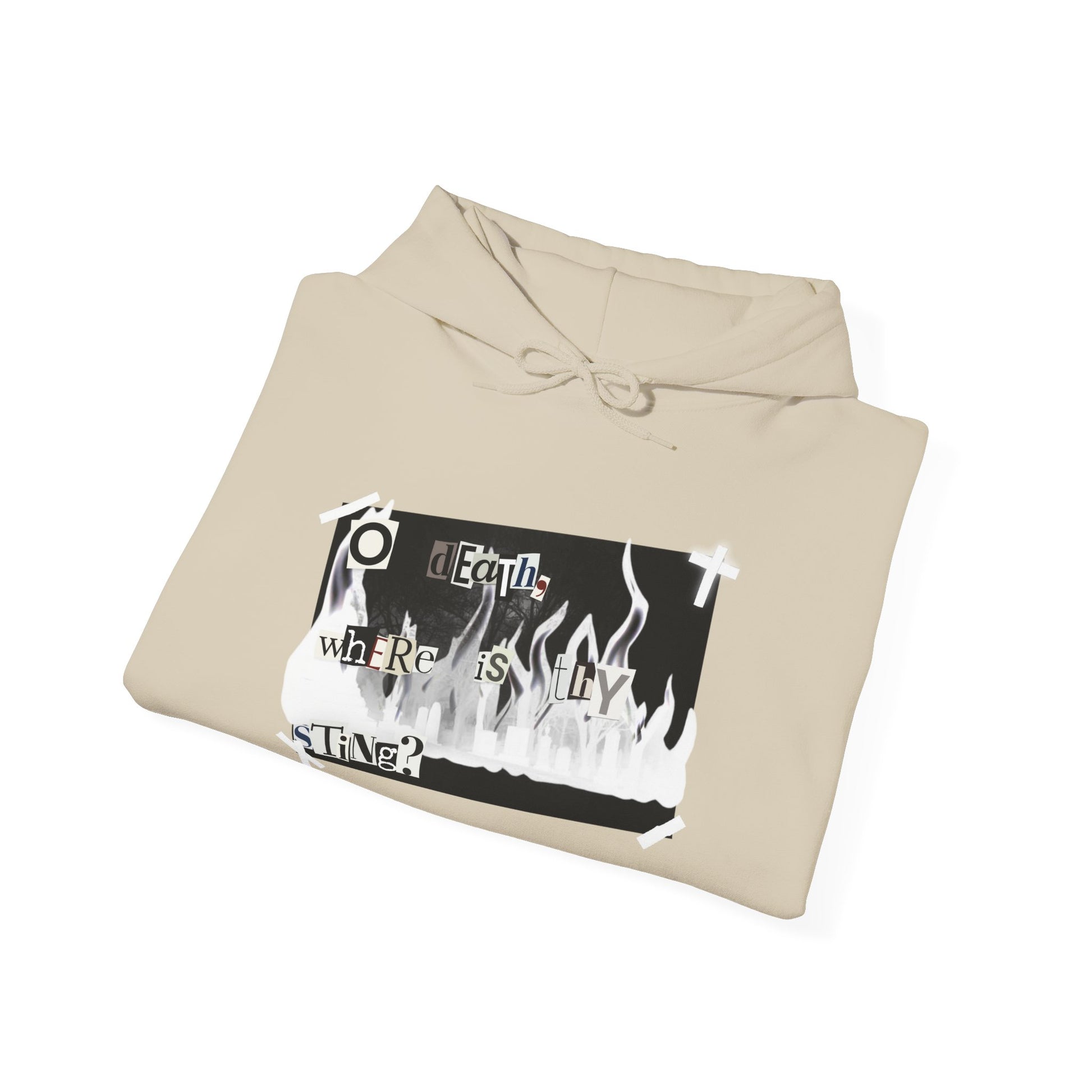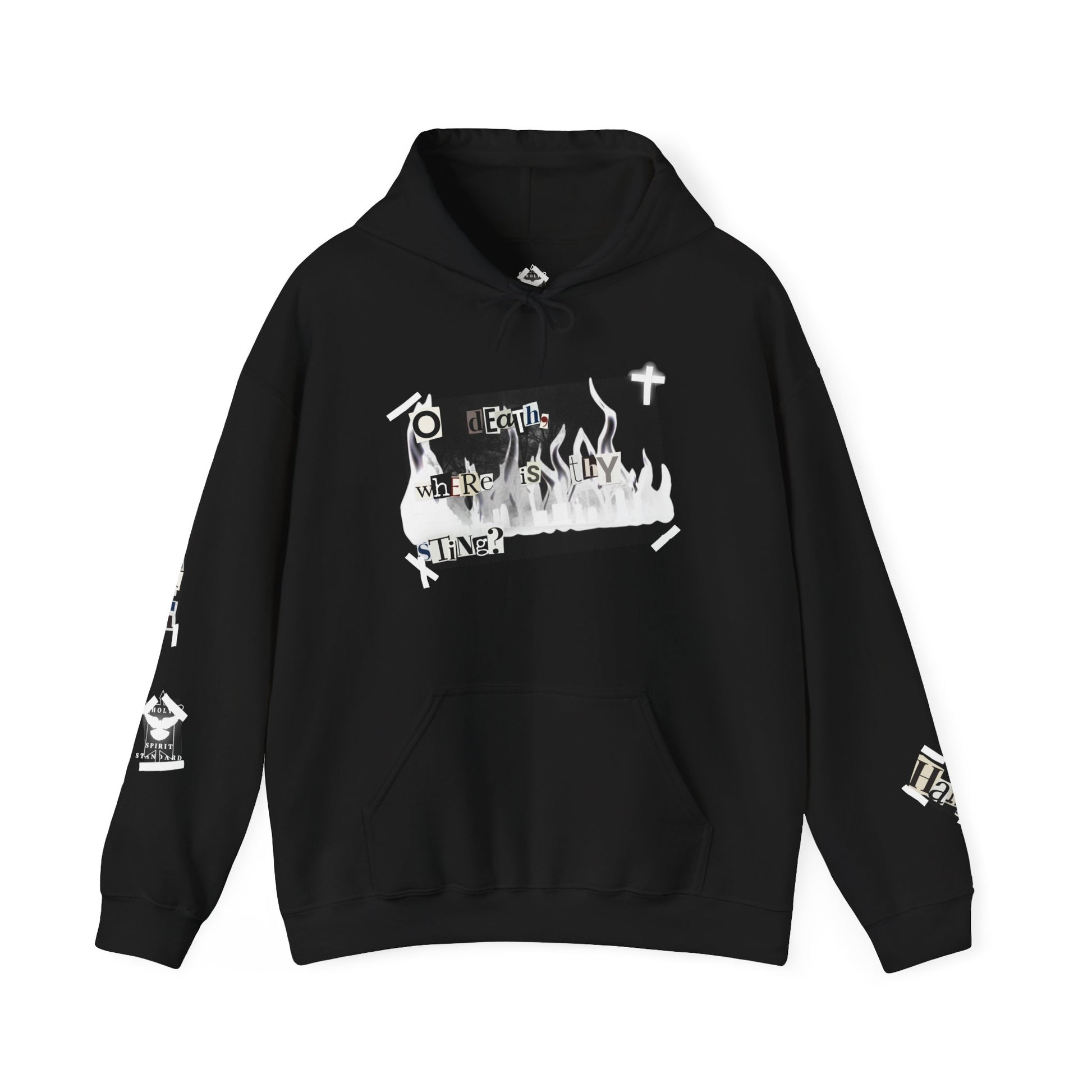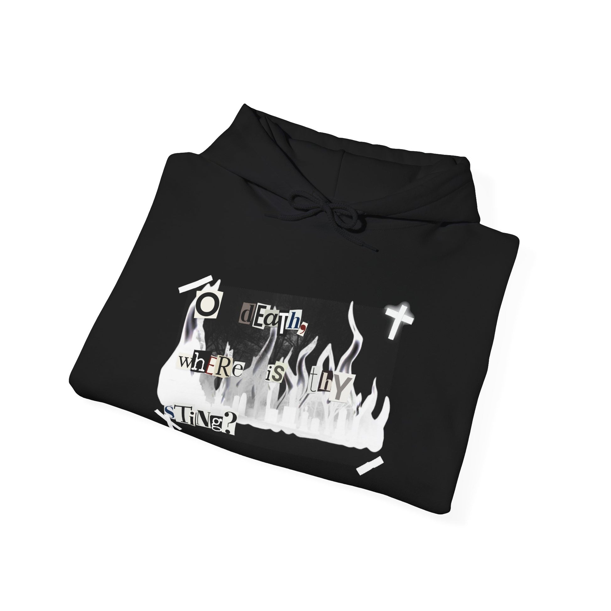 This hoodie features a powerful scripture quote from 1 Corinthians 15:55, giving a sense of strength and faith to the wearer. Perfect for those seeking comfort and warmth while expressing their confidence in Jesus to the world. Ideal for advertising who overcomes death and invites us to the same eternal life. Good for religious holidays, church events, evangelizing and just everyday soul saving wear.
