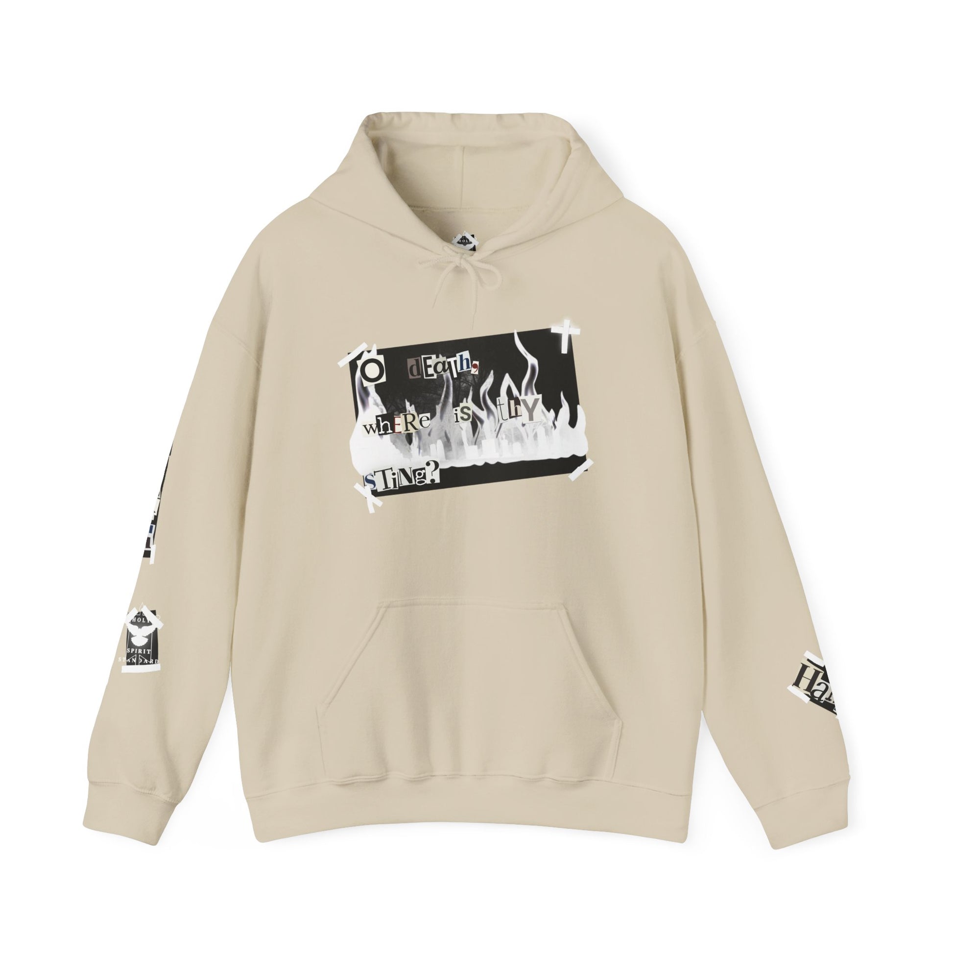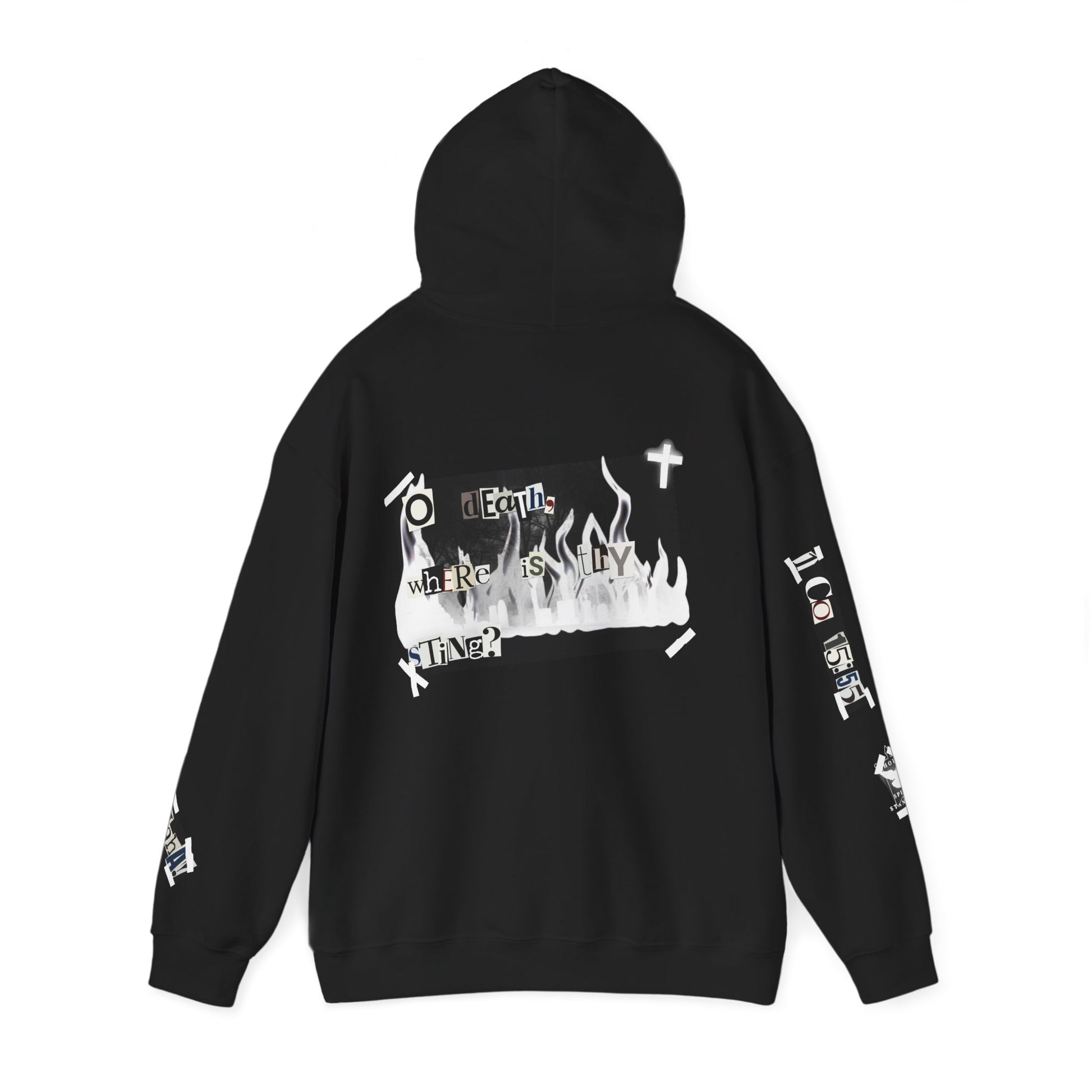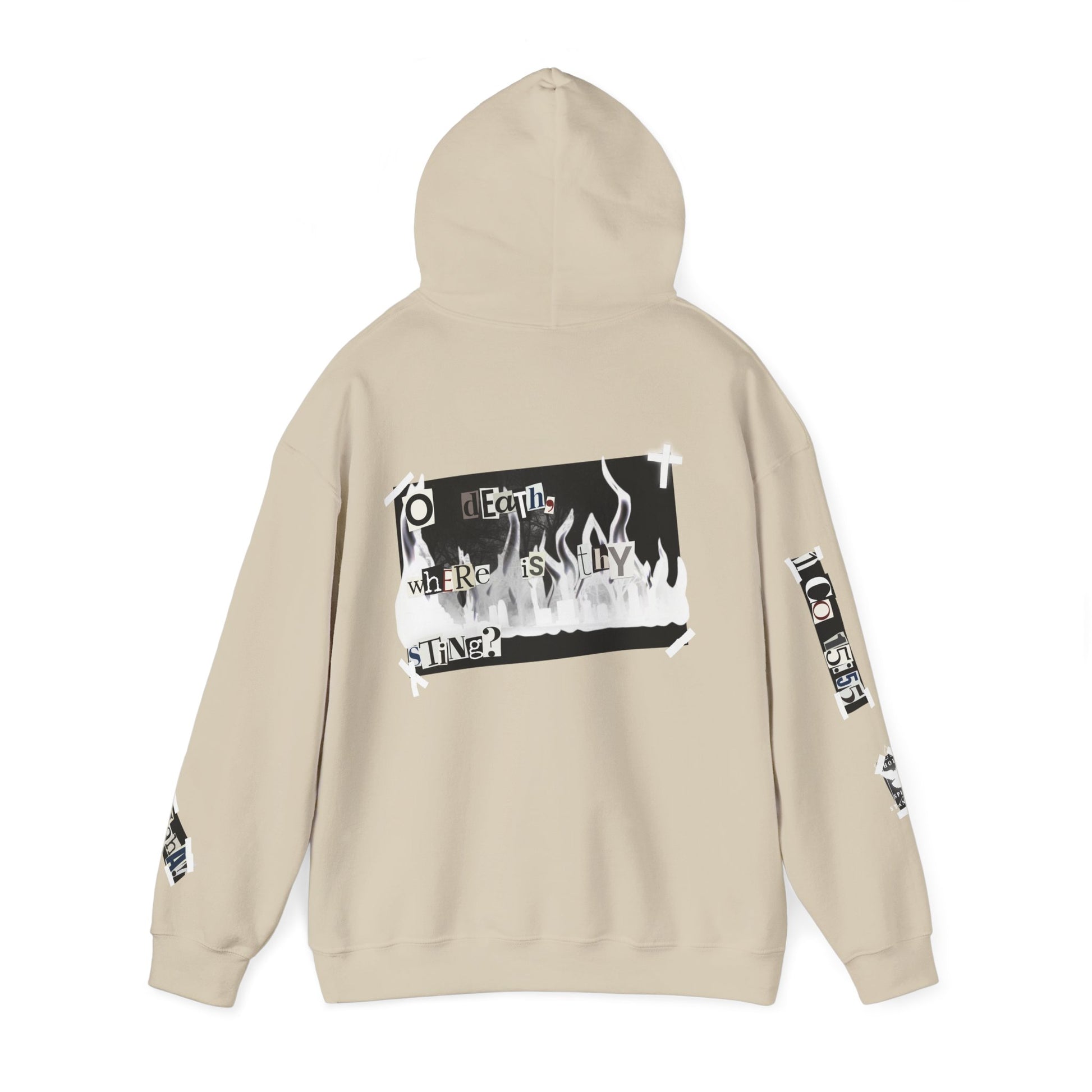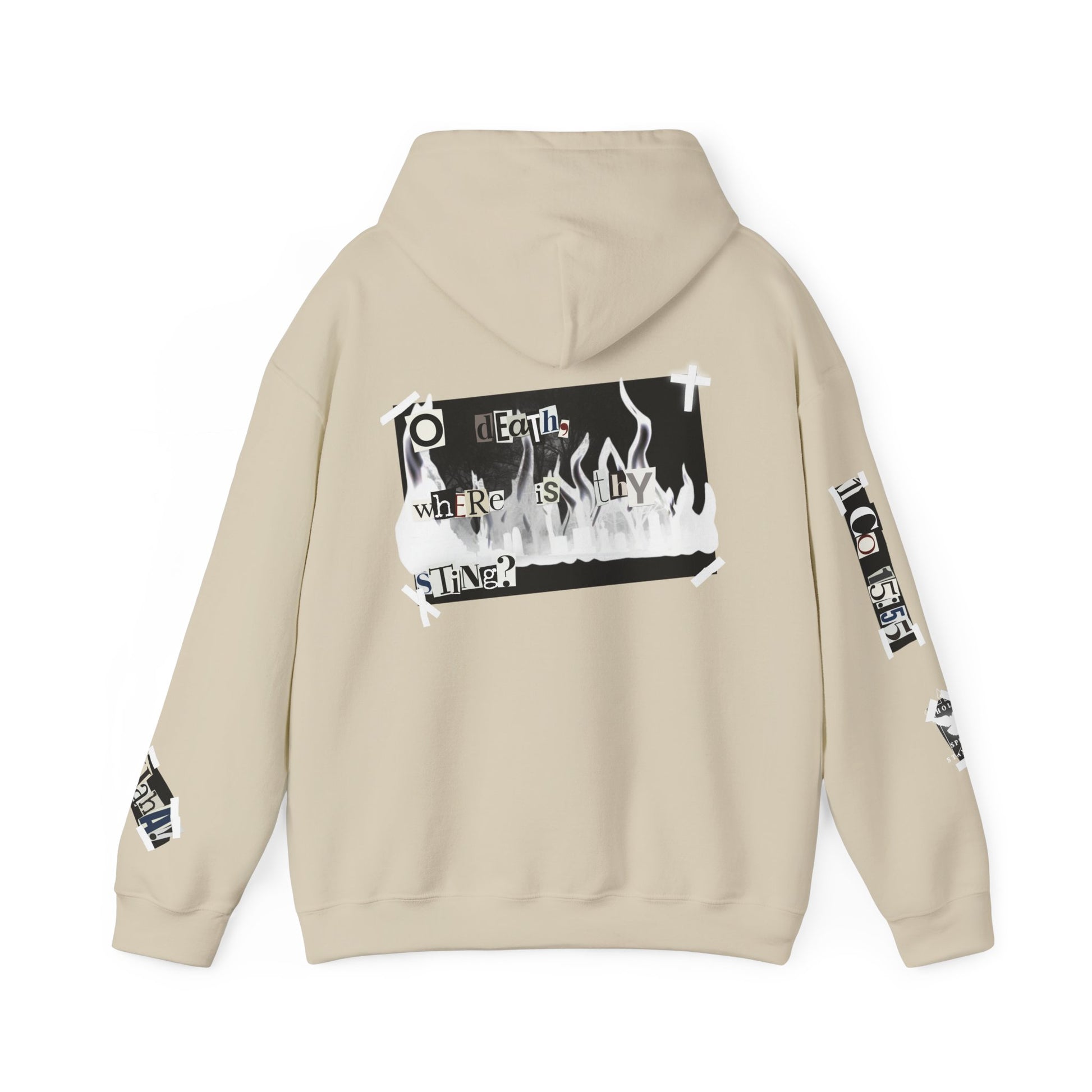 This hoodie features a powerful scripture quote from 1 Corinthians 15:55, giving a sense of strength and faith to the wearer. Perfect for those seeking comfort and warmth while expressing their confidence in Jesus to the world. Ideal for advertising who overcomes death and invites us to the same eternal life. Good for religious holidays, church events, evangelizing and just everyday soul saving wear.